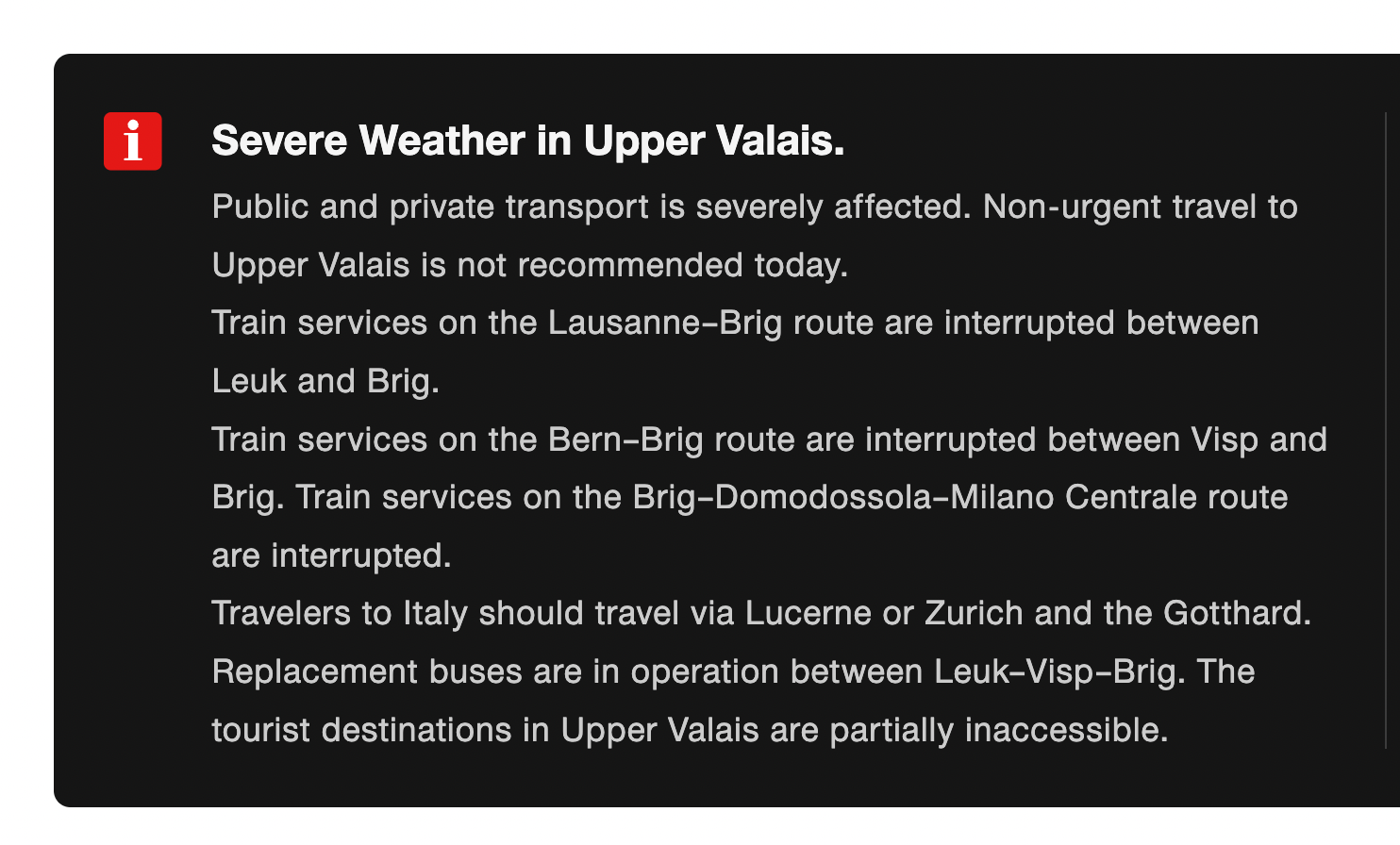 This affects ZERMATT which was reportedly without electricity yesterday night and the transport in the region (to and from Brig, and Zermatt)