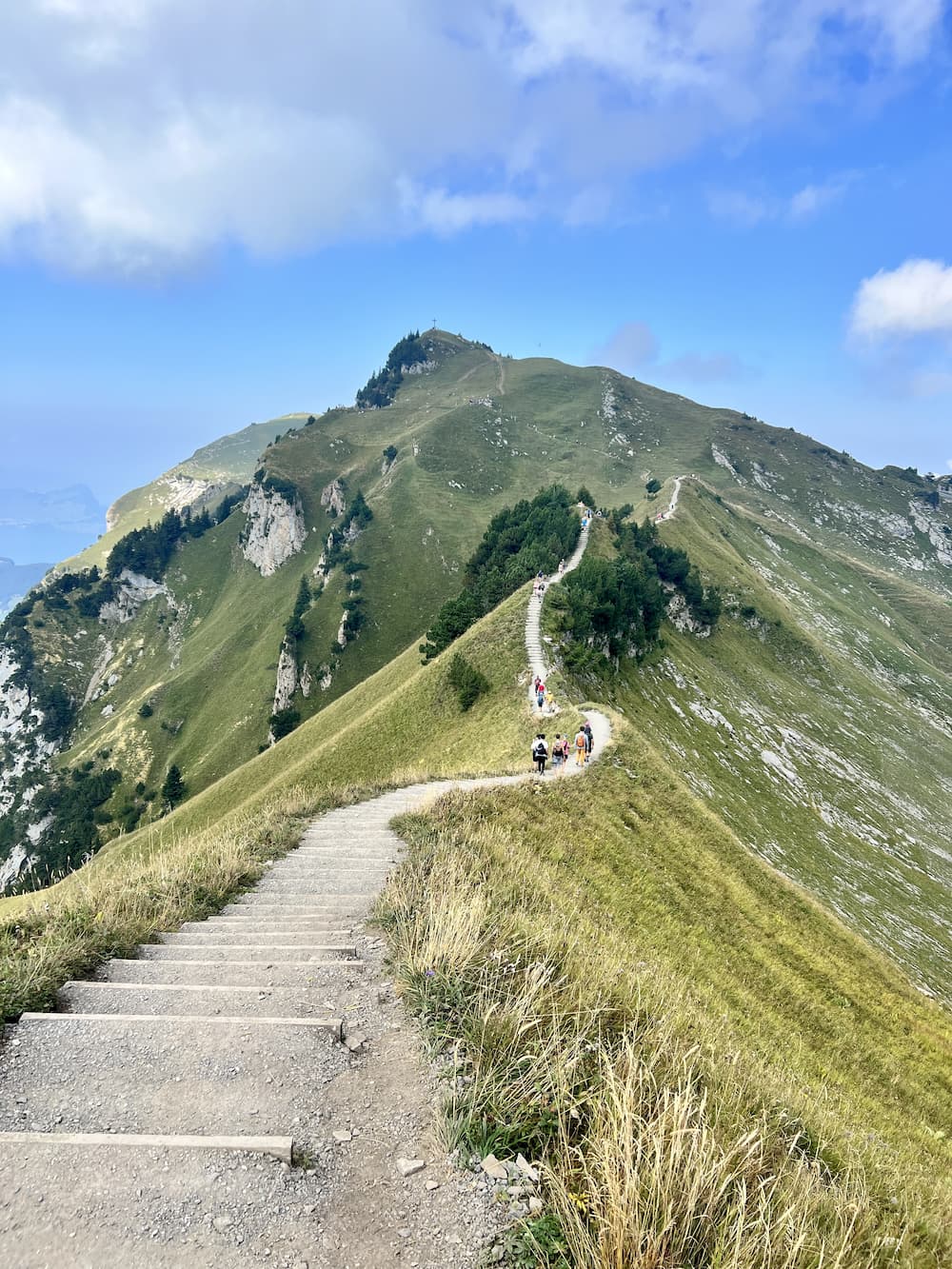 Honnêtement, c’est sur cette partie du sentier que l’on a les plus beaux points de vue. Si vous n’êtes pas amateur de randonnée, le simple fait de monter pour faire cette promenade vaut vraiment la peine d’y consacrer du temps. Vous pouvez voir Lucerne, le Rigi, Burgenstock et le magnifique lac bleu de Lucerne ci-dessous. Du sommet du Fronalpstock, qui culmine à 1922 m, vous avez une vue à 360 degrés et, s’il n’y a pas trop d’affluence, vous pouvez prendre un verre ou manger un morceau au restaurant.