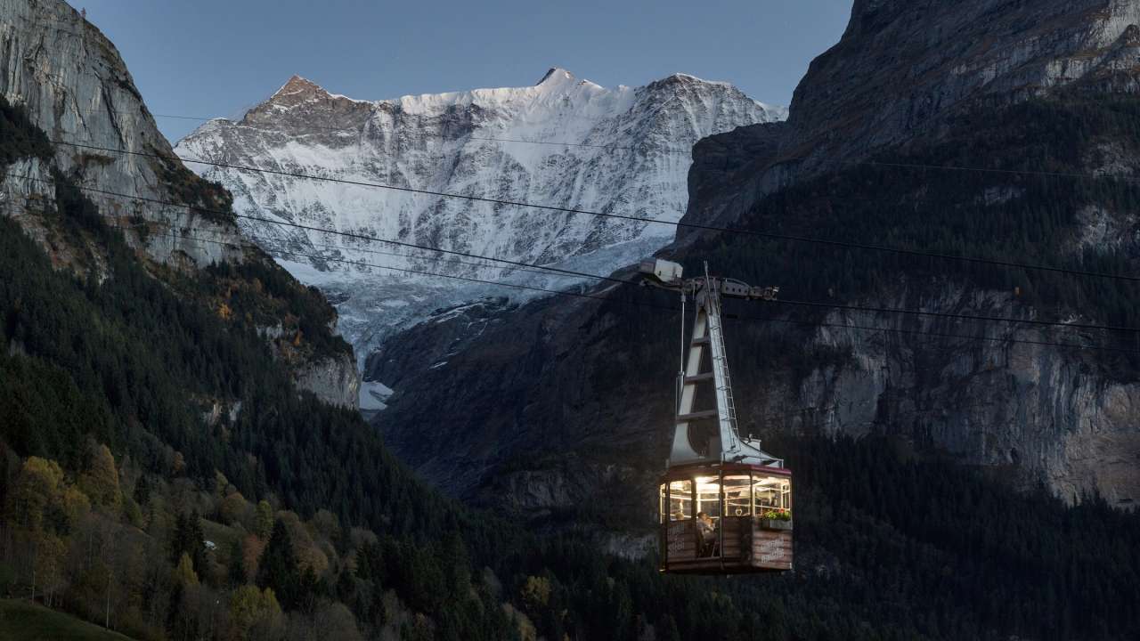 You ride in your own private cable car cabin at sunset, starting with an aperitif at the base, enjoying your dinner while floating above Grindelwald, and finishing with dessert back on solid ground.