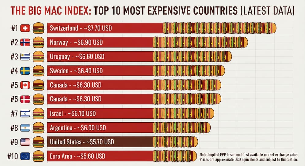 The Big Mac Index and Eurostat data regularly put Swiss food costs around 70 to 80 percent higher than the EU average.