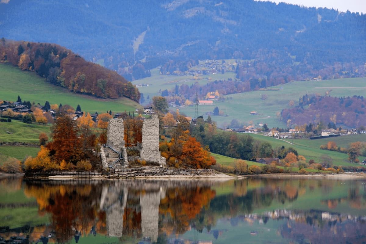 Ogoz is a tiny island in Lake Gruyère, situated southwest of Bern. It’s probably the best island to visit if you want to see something impressive that looks like it doesn’t belong in Switzerland. When the lake waters are low, there is a natural walking path to the island, which disappears when the water levels rise.