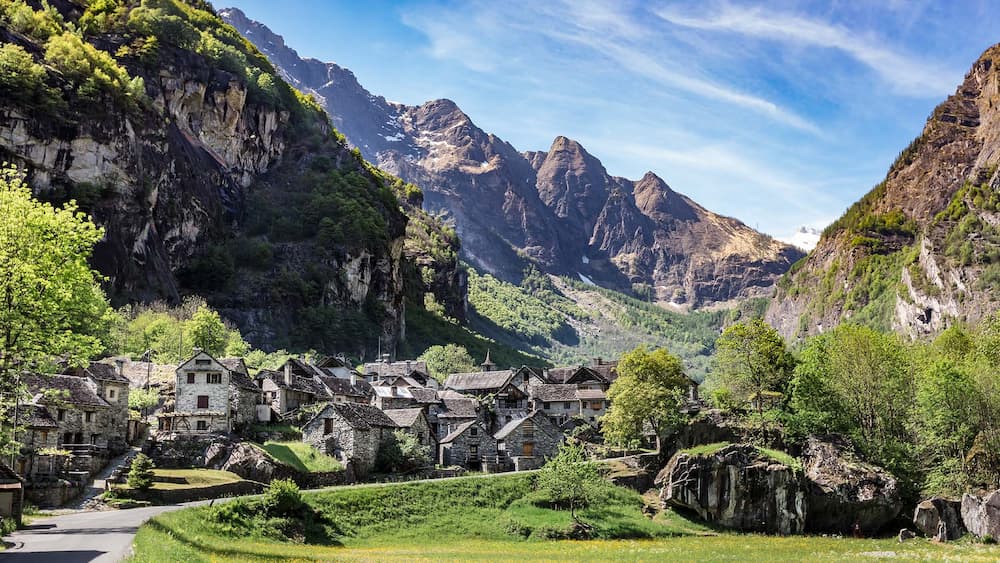 A village in the Val Bavona that is famous for a massive waterfall that drops right next to the stone houses. It looks like a film set from Lord of the Rings.