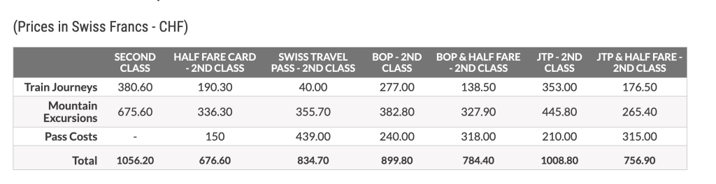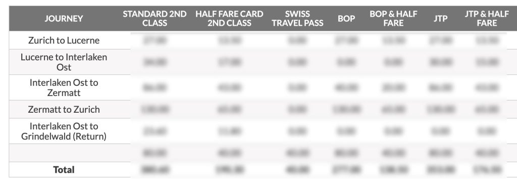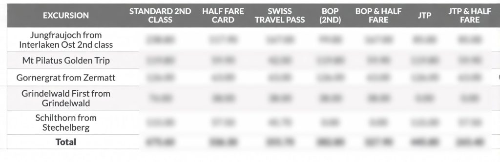 - Shows you the prices of the train passes (Swiss Travel Pass, Half Fare, Jungfrau & Berner Oberland also combined with Half Fare)